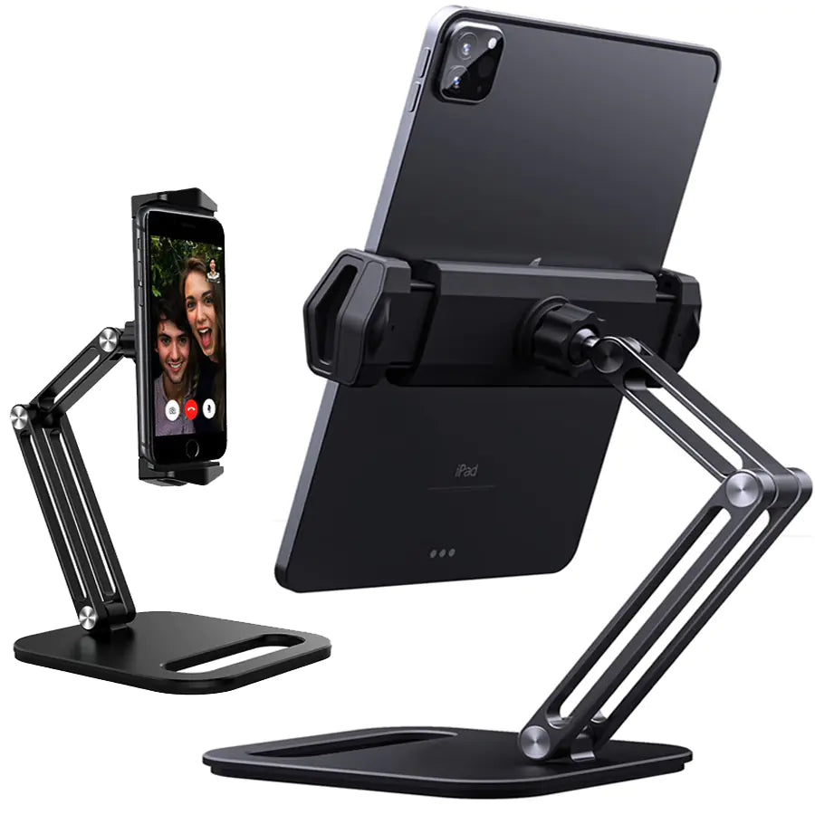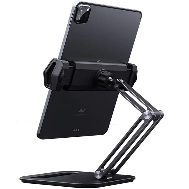 Adjustable aluminum alloy table stand designed for laptops, tablets, and books. Features ergonomic design for comfortable use in bed, on the couch, or at your desk.